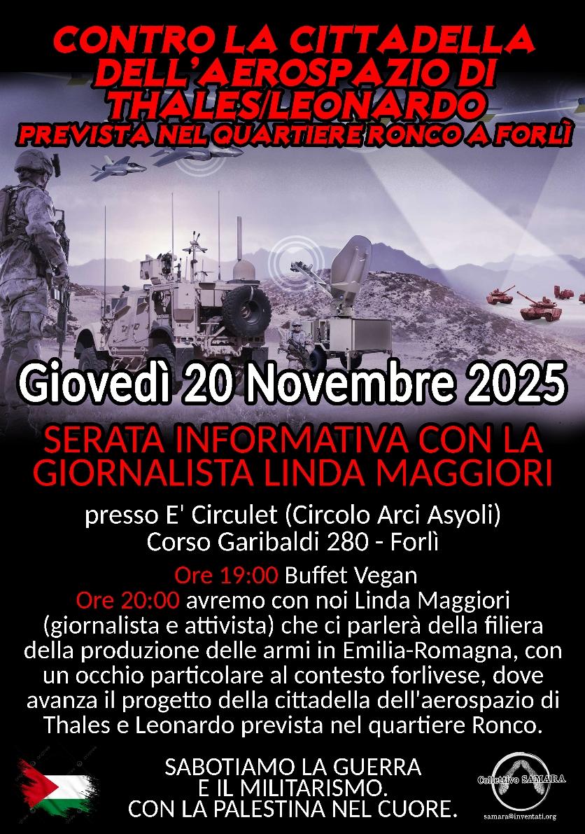* Ore 20.00 avremo con noi Linda Maggiori (giornalista e attivista) che ci parlerà della filiera della produzione delle armi in Emilia-Romagna, con un occhio particolare al contesto forlivese, dove avanza il progetto della cittadella dell’aerospazio di Thales e Leonardo prevista nel quartiere Ronco. L’iniziativa si terrà al “E’ Circulét” (Circolo Arci Asyoli), in via Garibaldi 280 a Forlì.