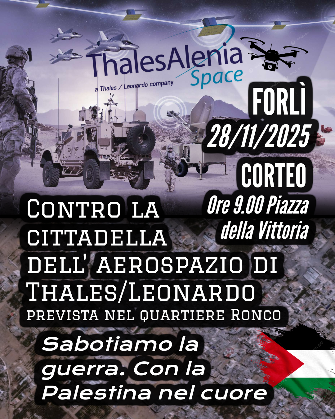 in occasione del nuovo sciopero generale lanciato dai sindacati di base contro la finanziaria di guerra e in solidarietà con la Palestina, a Forlì ci sarà un CORTEO contro riarmo, guerra e contro il progetto ERiS, ovvero la cittadella dell’aerospazio di Thales-Leonardo prevista nel quartiere Ronco per produrre ed assemblare antenne satellitari dual use (civile e militare). Il concentramento della manifestazione è previsto in piazzale della Vittoria a Forlì alle ore 9.00